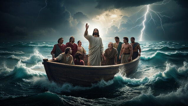 Jesus calming the storm, guiding disciples in a boat on turbulent sea
