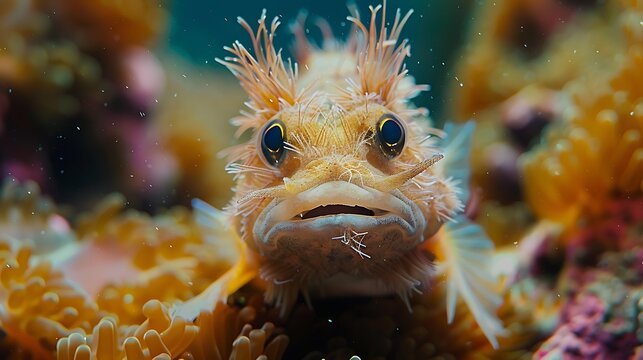 Hairy frogfish luring prey with fish-like appendage, coral reef: A hairy frogfish blends into the coral reef, using its fish-like appendage to lure unsuspecting prey close enough for a sudden