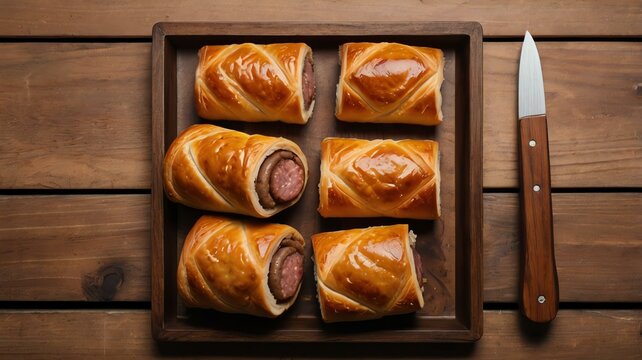 Australia sausage roll with golden puff pastry and meat filling, isolated on white transparent background, concept of baked snacks