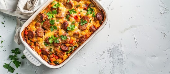 Savory sausage casserole on baking dish displayed on a white table with space for text in the image.