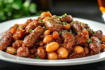 Summer outdoor dining with sausages, tomatoes, and drinks