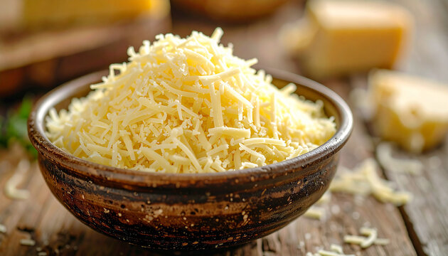 Grated cheese piled in ceramic bowl, appetizing cooking ingredient. Natural food product.