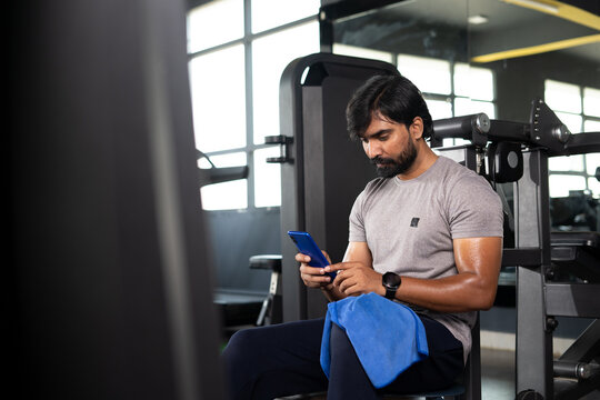 Young indian man monitaring or tracking calories using mobile phone appication at gym - concept of technology, checking workout plans and wellness