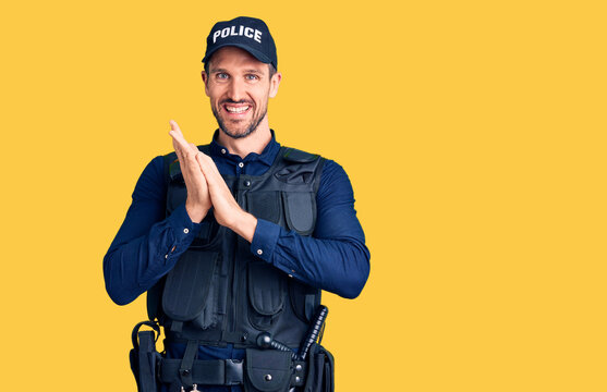 Young handsome man wearing police uniform clapping and applauding happy and joyful, smiling proud hands together