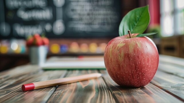 A red apple with a green leaf next to a pencil on a wooden desk, set against a classroom background with a chalkboard in the distance.