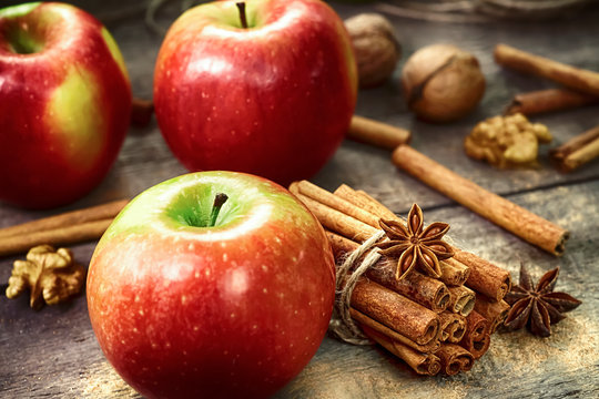 Fresh red and green apples, cinnamon sticks, ground cinnamon, anise stars, walnuts and hazelnuts on an old wooden background