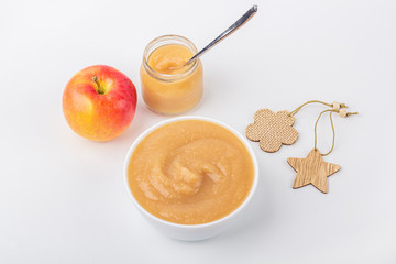 apple pieces, sugar and syrup in pan, ready for boiling. Apple jam cooking  process.