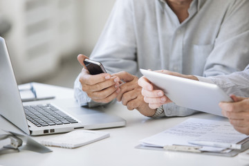Close-up of a person's hands using a smartphone, with vibrant bokeh lights creating an attractive backdrop
