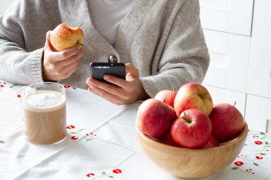 Unrecognizable person in warm jacket eating fresh apple and browsing smartphone while sitting at table with cup of coffee at home