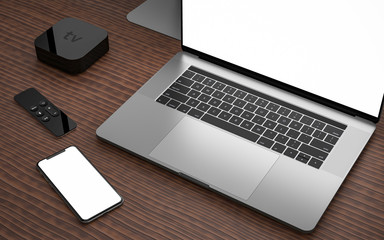 Apple MacBook Pro on the wooden desk on a plaster background