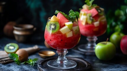 Chilled fruit falooda with watermelon, apple and kiwi in festive serving glass