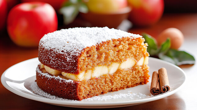 Apple bread with a scoop of ice cream and maple syrup on a gray plate. Autumn fruit pie, gray background.