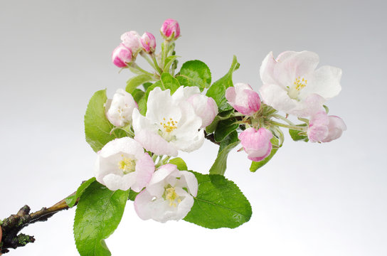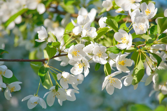 Blooming apple tree branch with white gentle flowers at sunny spring day
