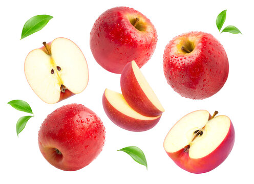 Red apples and slices, arranged on white background