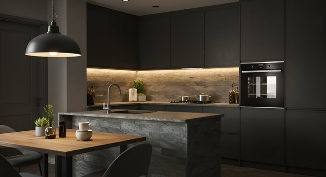 Modern kitchen interior with stylish dark cabinets and stone countertops. A wooden dining table with chairs is set in the kitchen, showcasing a contemporary design.