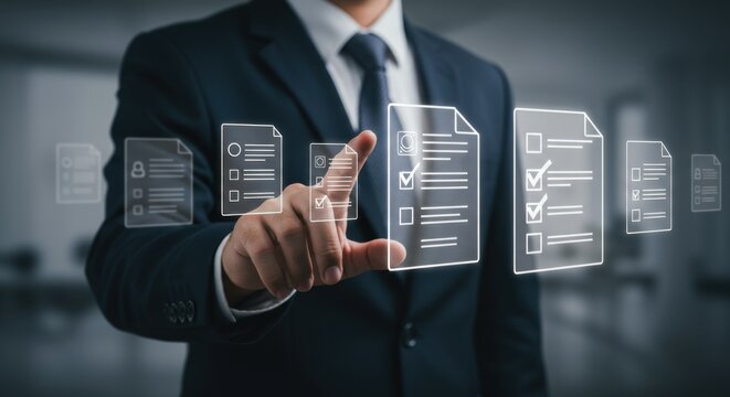 A professional selects a candidate's resume on a holographic interface. This image symbolizes modern human resources management, digital recruitment, and the strategic process of finding the right tal
