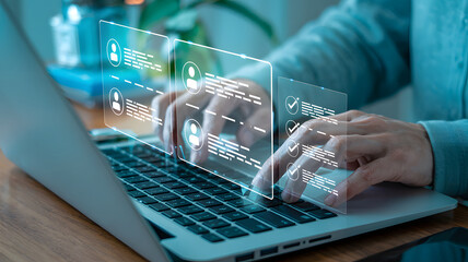 Human resources manager using digital tools for candidate screening, resume analysis, and recruitment process. Concept of CRM, HRM, employee selection, hiring, and applicant tracking system.