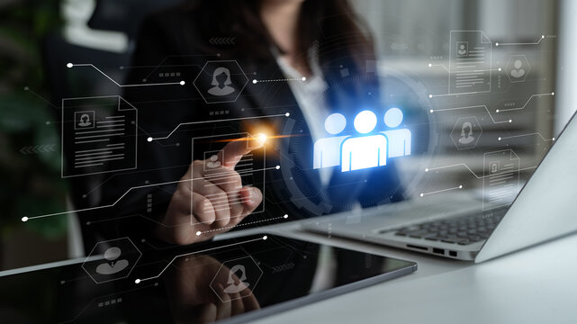 Concept of a digital human resources platform for workforce management. An applicant tracking system helps in team building by organizing employee and candidate profiles. Fermion
