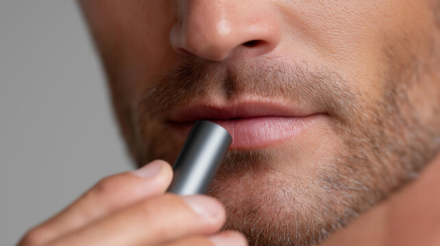 Professional macro shot of a man applying lip balm, lower face only, with elegant minimalist tones and soft lighting for beauty, grooming, and skincare product promotion. lip care, lip balm applicatio