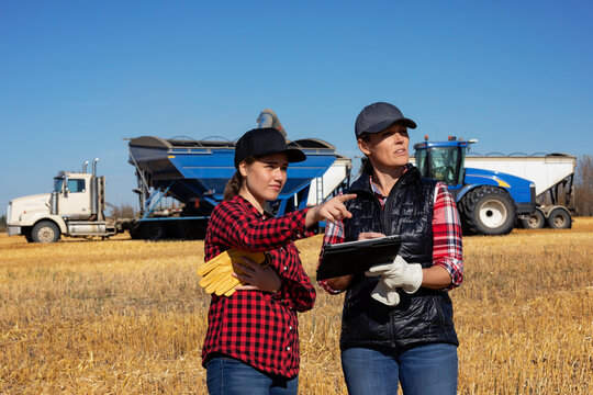 Woman farmer teaching apprentice advanced farming technologies during grain harvest, Alberta, Canada