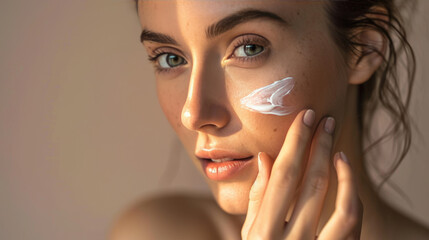 Beautiful middle aged woman applying cosmetic cream treatment on face isolated on grey background. Mock up and copy space. Cropped image
