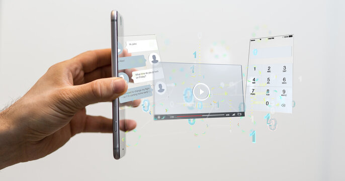 Hands interacting with smartphone and colorful digital icons