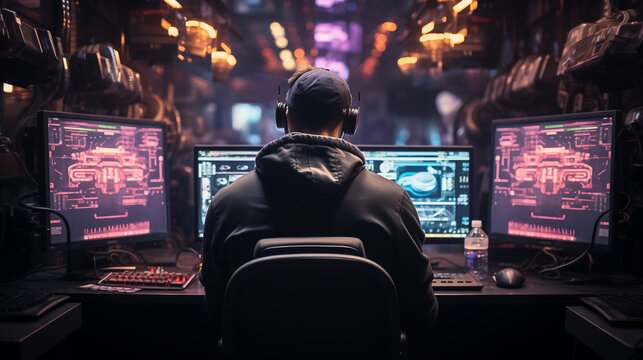 Software developer freelancer with white headphones and glasses working with program code: C++ Java, Javascript on wide displays and smartphone at night. Develops new web, desktop, mobile application.