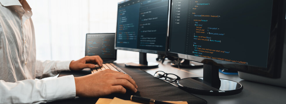 Software engineer working on application development on his computer display code and script on monitor at tech company office workplace. Application developer solving and writing code. Trailblazing