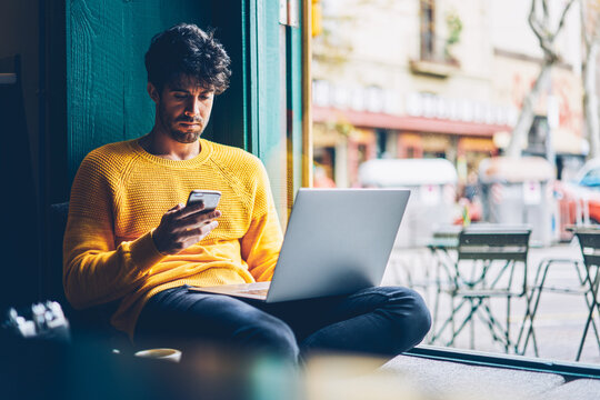Young Indian business woman freelance entrepreneur using cell phone mobile AI app, laptop. Smiling Latin Hispanic female student holding smartphone for shopping, online browsing, learning outdoors