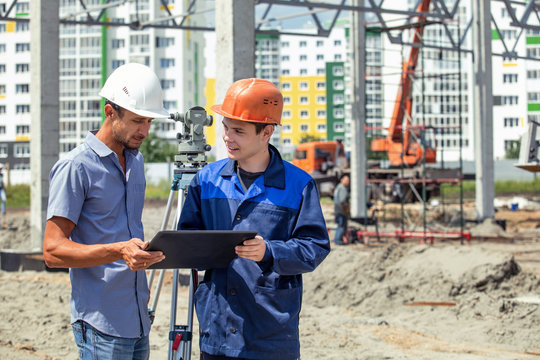 Engineer foreman gives orders to workers and builders who build a building on the construction site