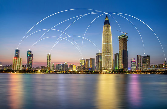 Shenzhen Houhai CBD skyline and cloud computing concept