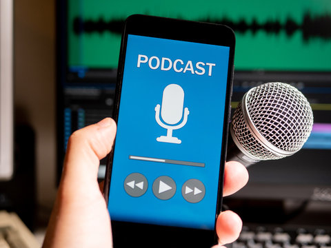Podcast stuido. Phone with podcast app playing in front of microphone and edting program on screen.