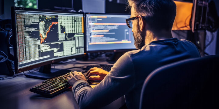 Male coder programming server encryption on firewall software, using security network to code system data for development. Working with text information to script program. .