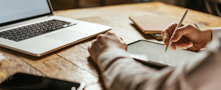 Male hands drawing on digital tablet with electronic pen. Freelancer designer working remotely. Close-up photo