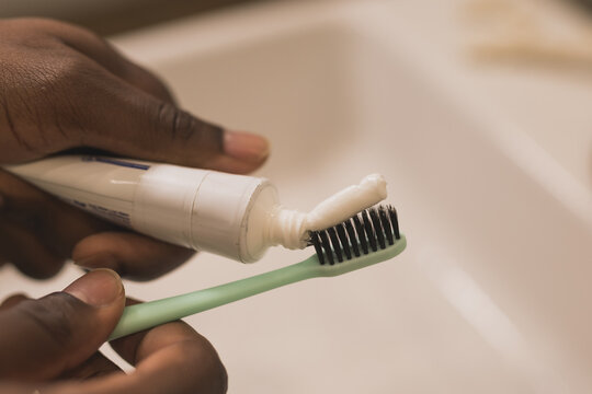 Close-up of a toothpaste tube being applied to a blue and white toothbrush, against a solid color background. .