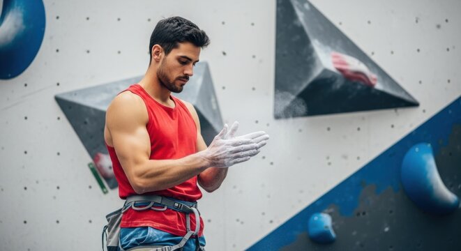 Young man in red tank top applying chalk to hands before indoor rock climbing session