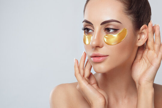 Beauty model girl face with healthy fresh skin. Woman with under eye collagen gold pads.  Skin care concept, anti-aging moisturizing eye mask, golden hydrogel patches, eye skin treatment, cosmetology