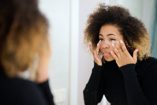 African american woman applying hydrating under eye mask in bathroom