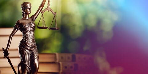 Legal law concept image Scales of Justice and case books on desk.
