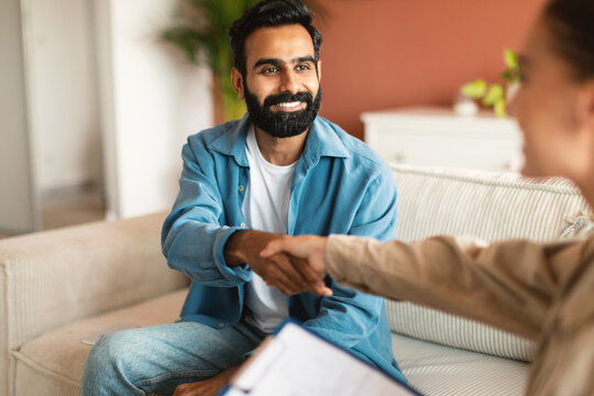 Top view hands of agent and client shaking hands after signed contract buy new apartment.