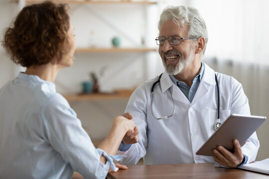 Smiling elderly male doctor or GP shake hand of female patient close healthcare insurance deal on tablet, happy mature man physician handshake client at consultation, get acquainted greet in hospital