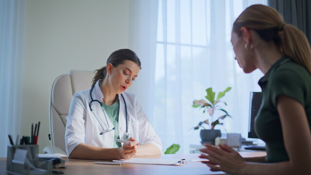 Woman patient talking doctor in clinic. Therapist consulting polyclinic visitor