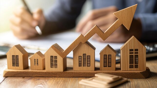A wooden model of houses shows a rising trend line, symbolizing growth in the real estate market and investment potential.