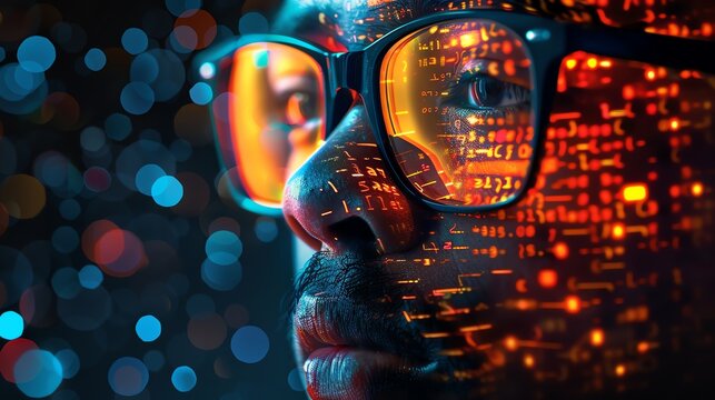 A mans face with glasses reflecting a vibrant visualization of coding data, symbolizing digital expertise