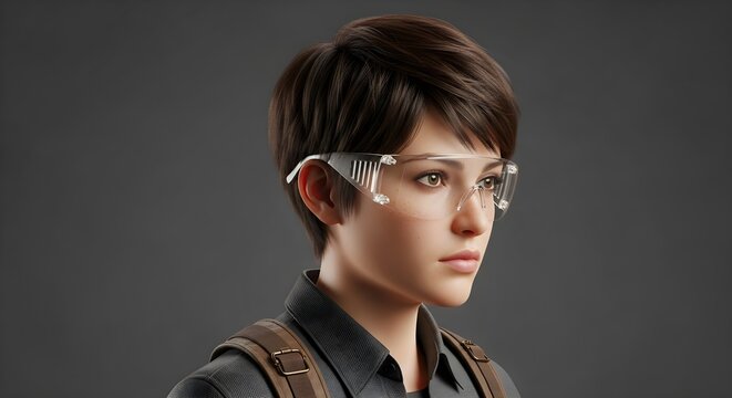 Determined young woman wearing safety goggles and backpack, ready for adventure or work projects