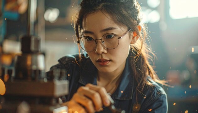 Young Asian woman engineer meticulously working on machinery, cinematic portrait capturing her intense focus