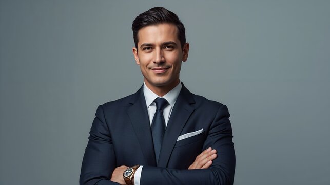 a confident man in a tailored suit, exuding professionalism and composure. Arms are crossed, and a slight smile gives a approachable look