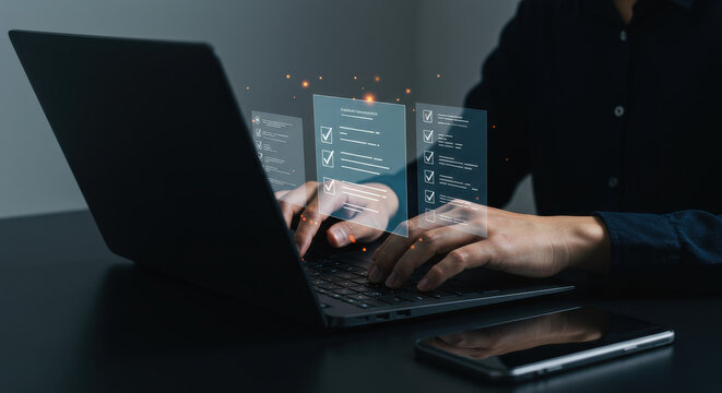 Quality Assurance and Document Control with Checklist Icons. Businessman mark off items on digital checklist, representing quality assurance and document control processes, verification and compliance