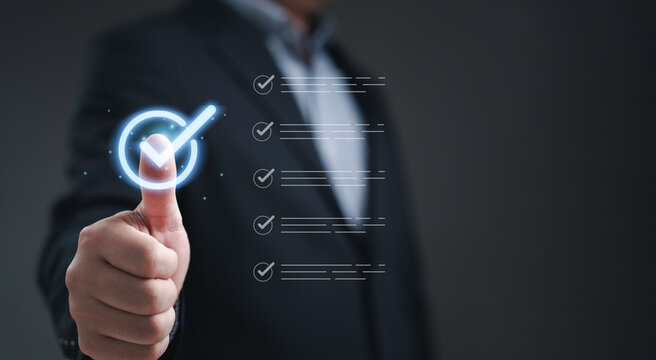 Businessman touching digital checklist icon representing document approval process quality control task management and successful completion in modern business technology.