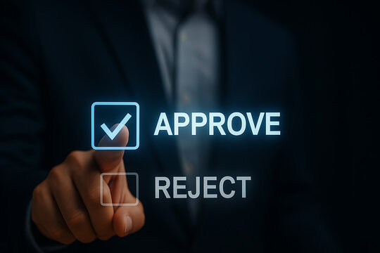 Business decision making concept with digital approve and reject buttons highlighted on futuristic technology interface